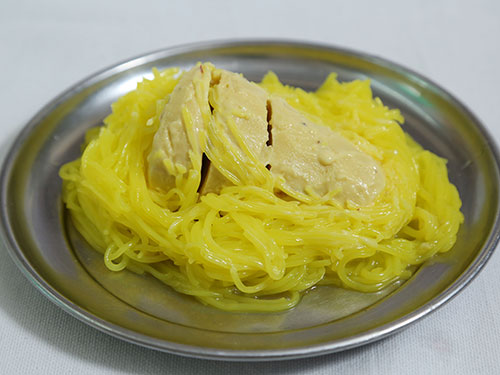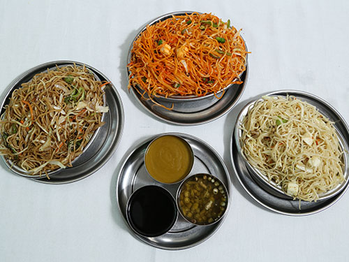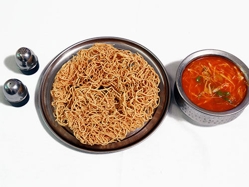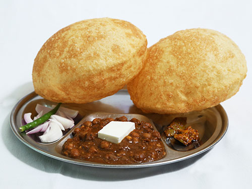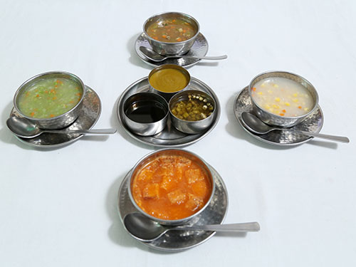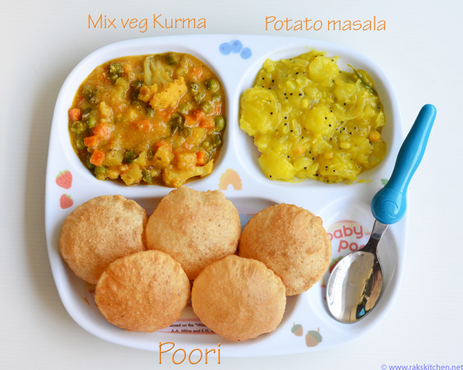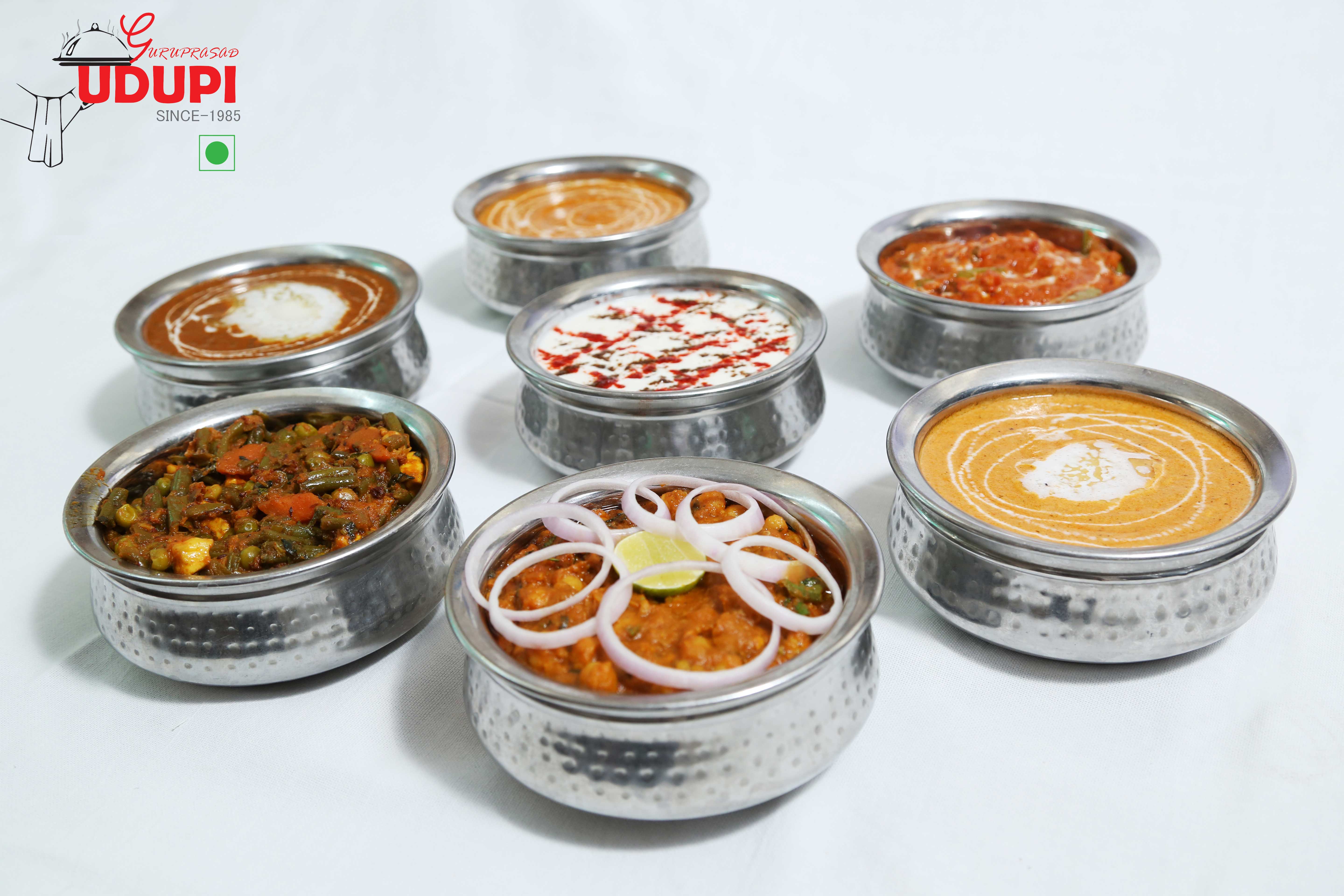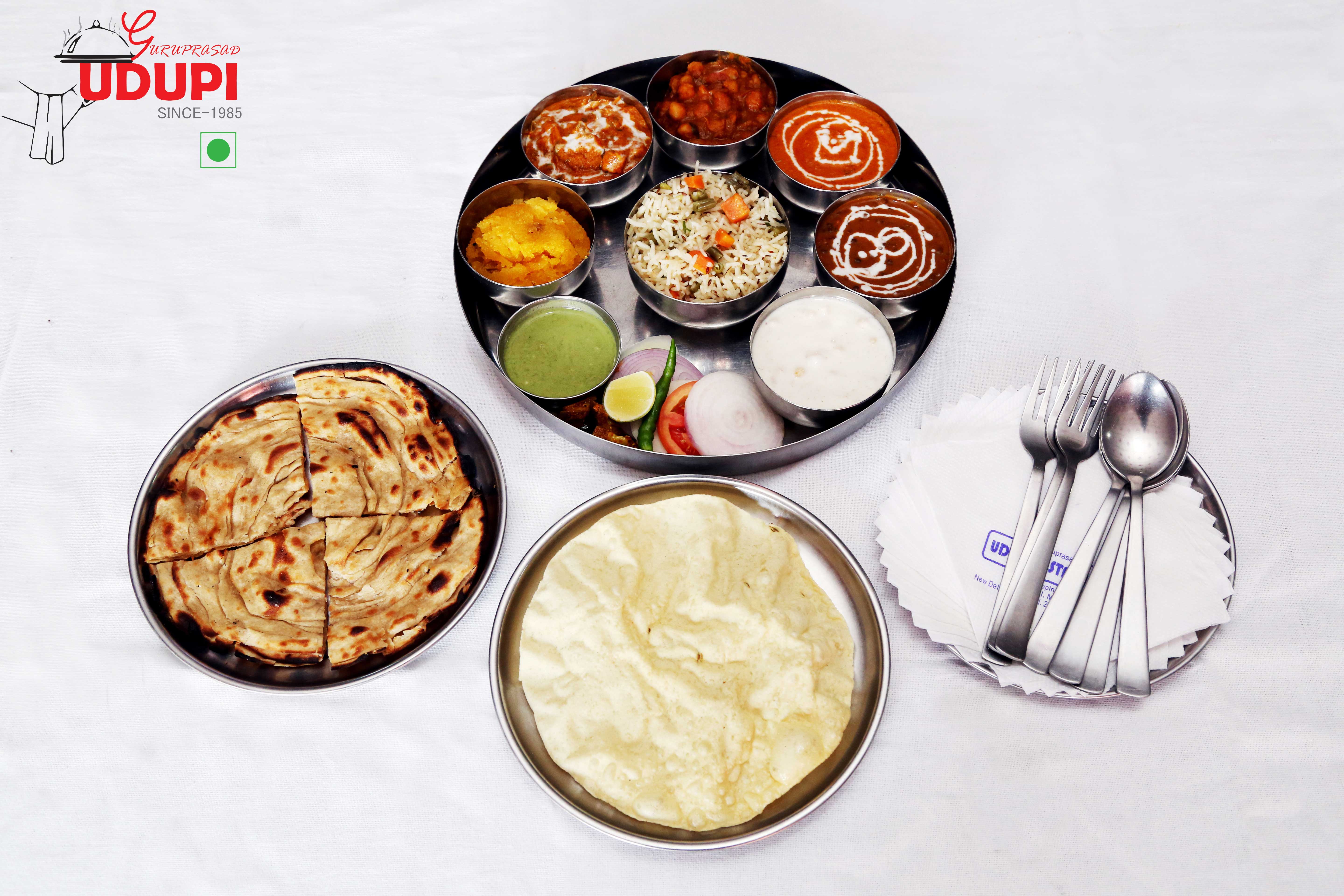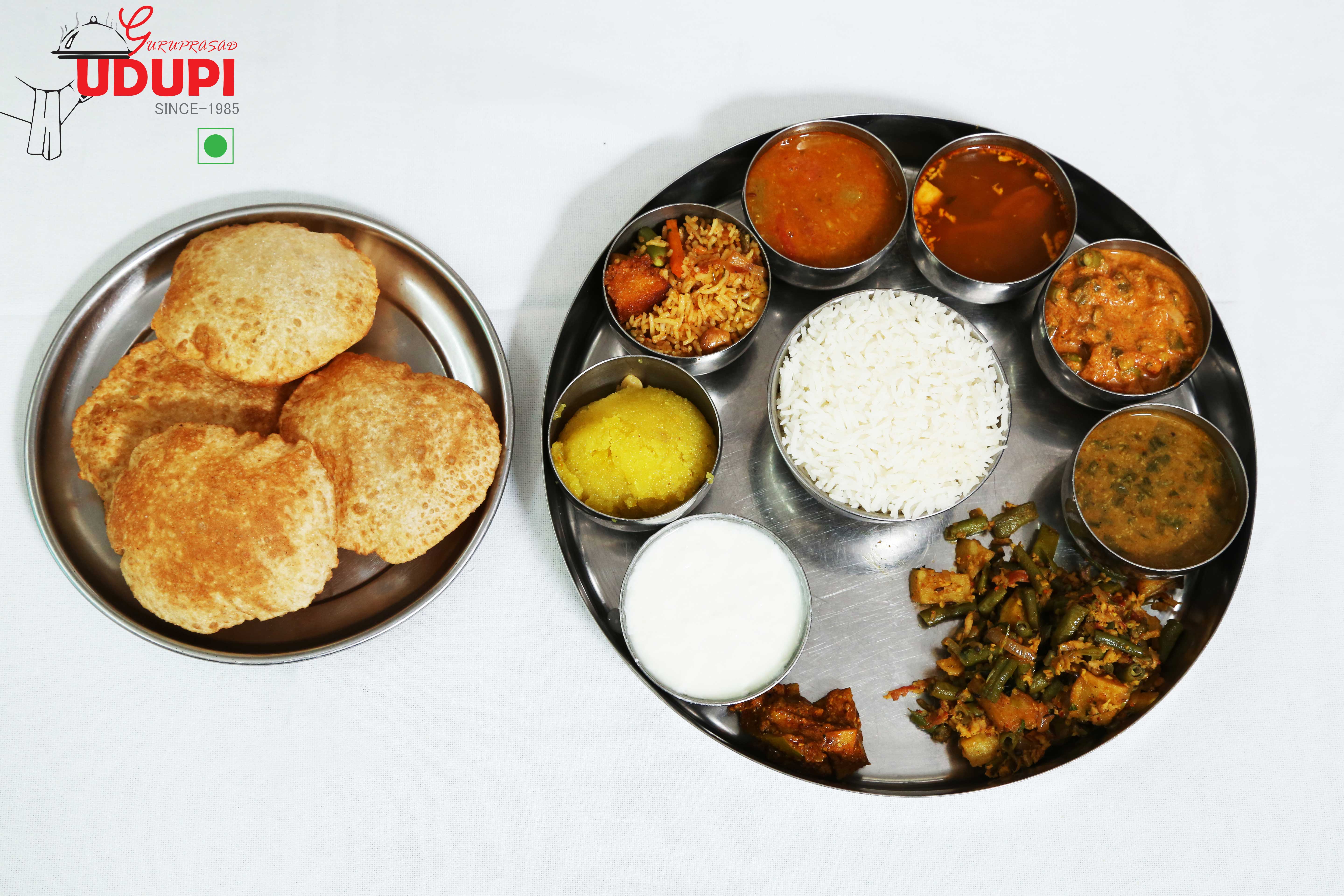1 Bowl rice, 4 poori, 2 vegetable, sambar, korma, rasam, papad, curd, sweet, pickle (For a person only)